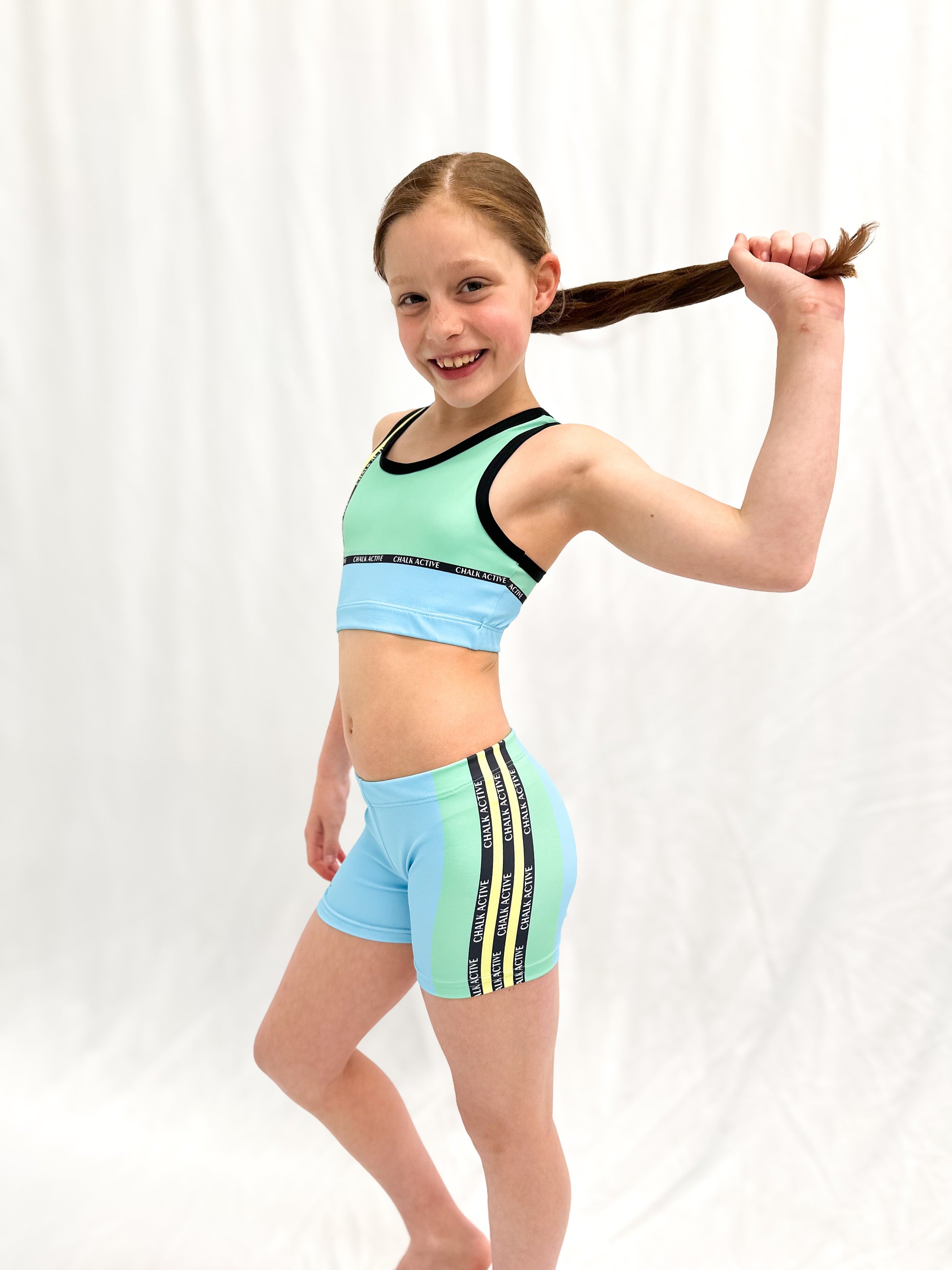 Stay active and stylish in our Serenity Crop, featuring a bold, sporty Chalk Active print that captures energy and movement. Perfect for gymnasts on the go, this crop top provides the perfect combination of performance and style. Don't forget to snag a matching sweater, leotard, and shorts to complete your look for the ultimate coordinated, high-performance outfit.